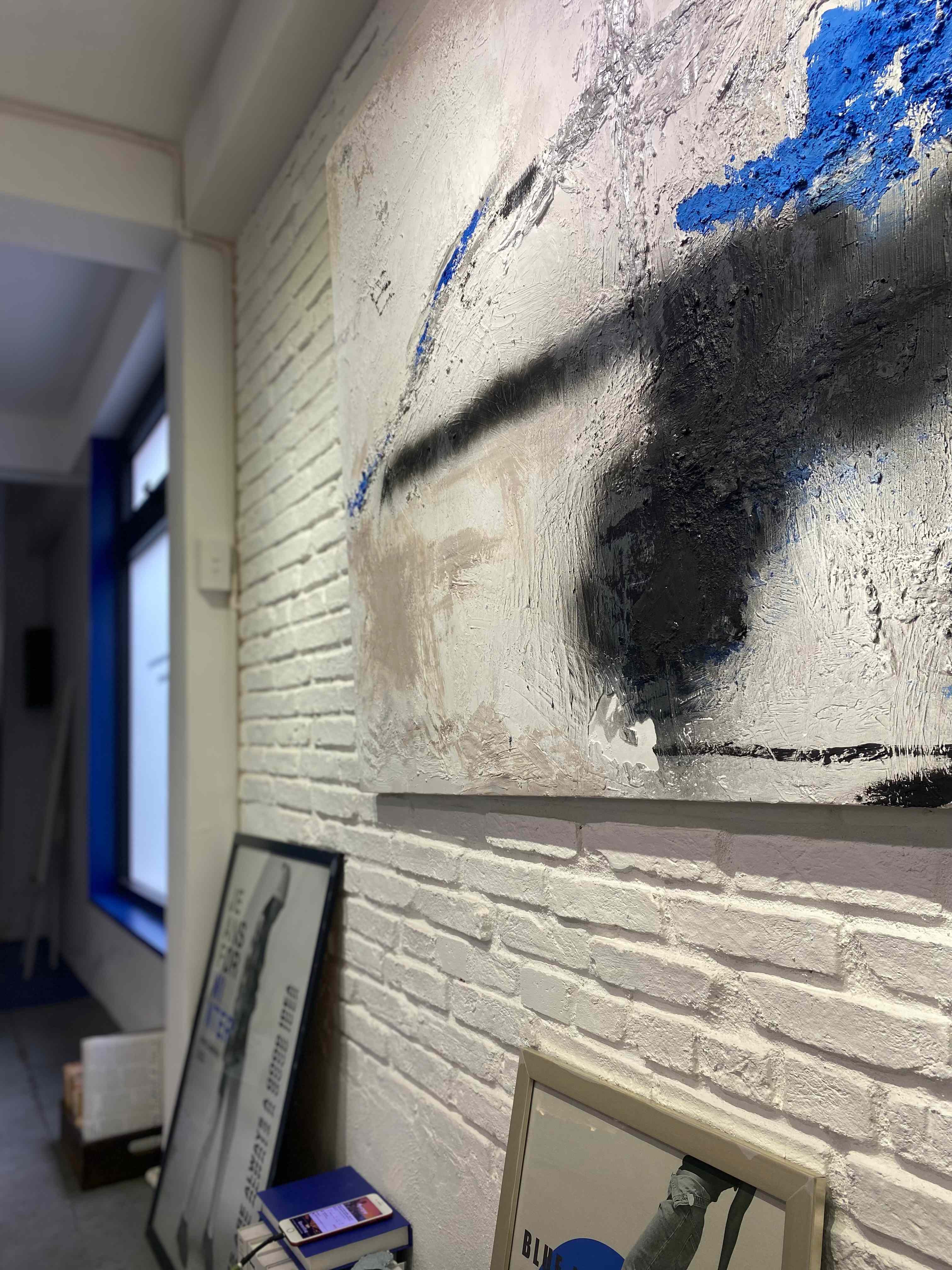 GAM took advantage of the homemade paintings, which only cost the price of buying paint, frames, and a little bit of the efforts. We borrowed the blue color, which represents the sky and the world-famous infinity of Yves Klein. This blue color also happens to be the color that Levi Strauss used to dye the rough jeans of miners made from denim in the late 19th century. There is only one shade of blue, but there is a variety of textures from the pigments and the diagonal fabric of the jeans. All these elements blend to become an important highlight in our design. In addition, to create a contrast between the softness of the white painted walls and the roughness of the paintings and jeans, we used the hardness, shininess, and slightly refractive properties of metal and glass. Opposites create balance.