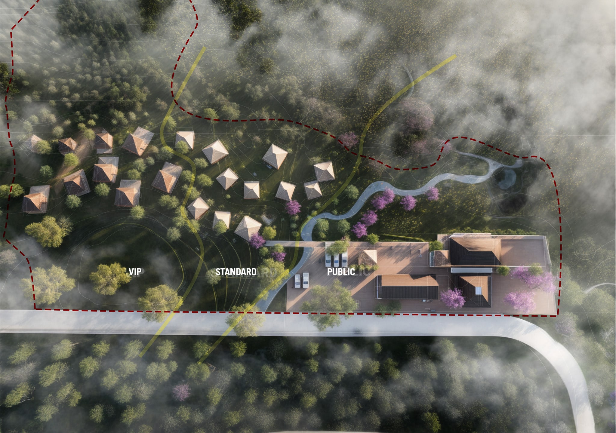 In the new master plan, we have designed a clear separation between the bungalow complex (divided into two segments: VIP and Standard) and the public area to ensure privacy