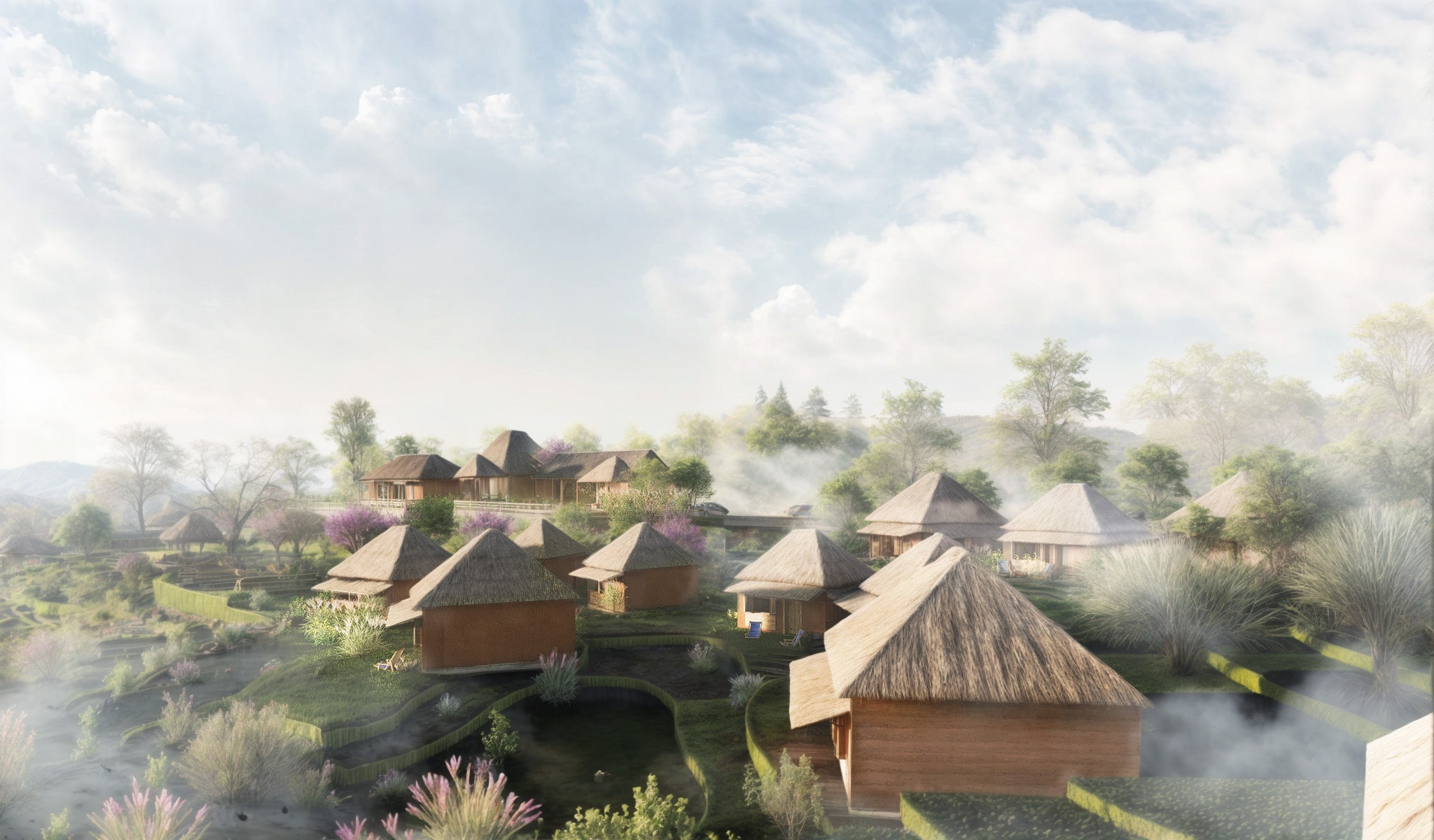 A natural stream runs between the two zones, serving as both a natural boundary and an enhancement to the landscape. The bungalows are constructed in rammed-earth, preserving their distinctive square proportions.